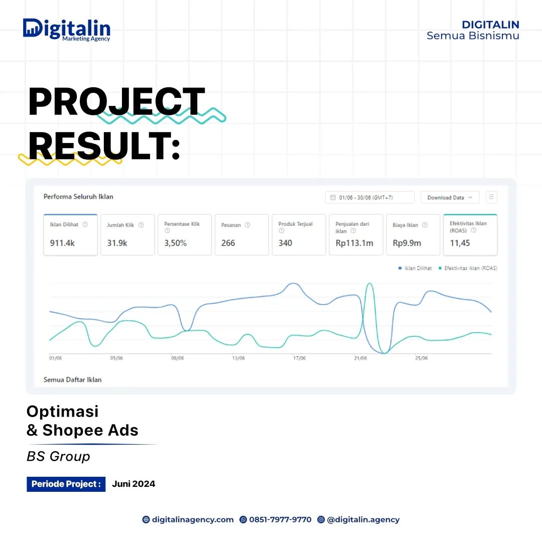 Hasil optimasi iklan Shopee Ads selama Juni 2024 menunjukkan performa yang cukup efektif. Dengan biaya iklan Rp9,9 juta, iklan menghasilkan penjualan Rp113,1 juta dan ROAS 11,45, yang menandakan return sangat baik dari investasi iklan.