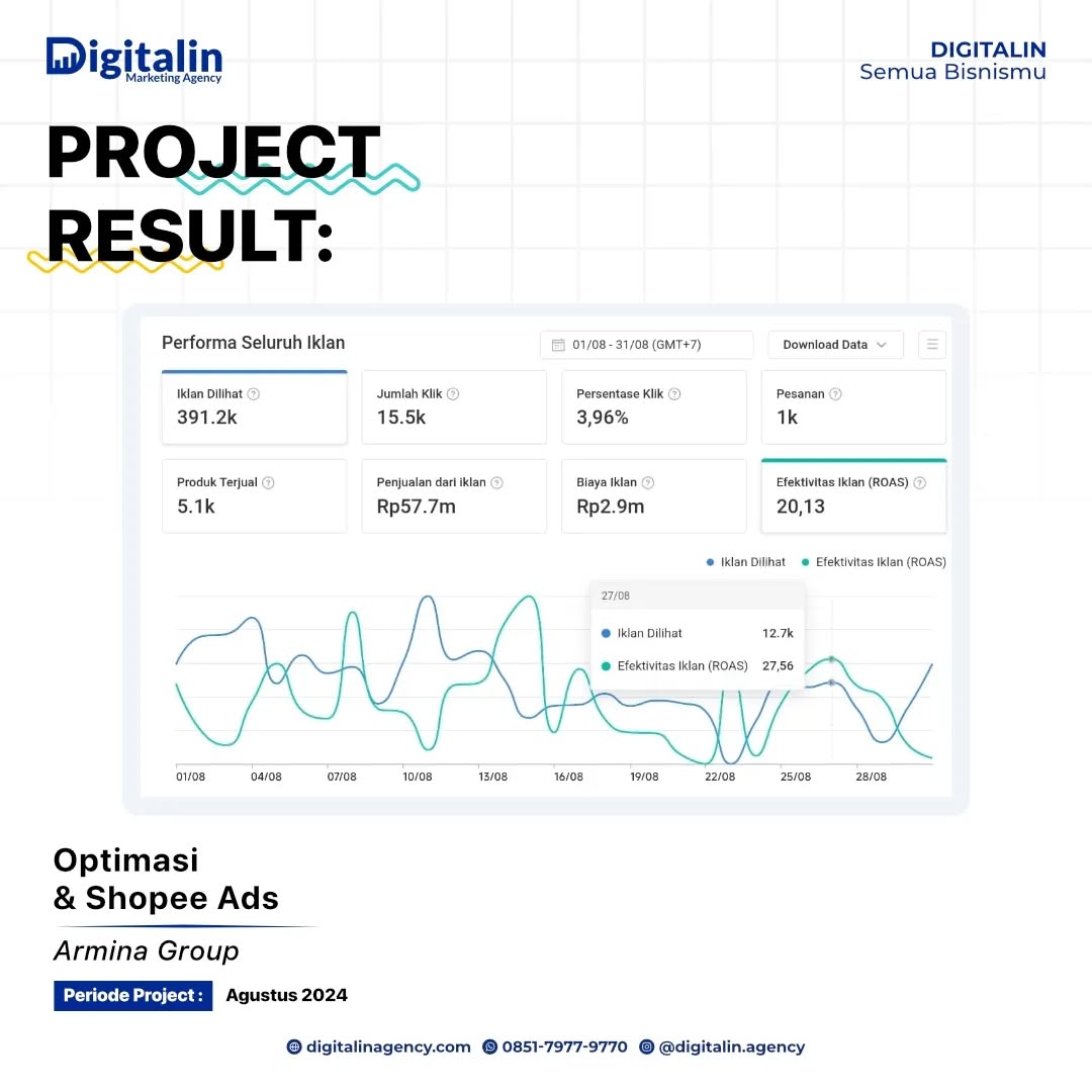 Kampanye Shopee Ads Agustus 2024 untuk Armina Group sangat sukses. Dengan investasi kecil, hasil penjualan tinggi dan efektivitas iklan luar biasa (ROAS 20+), menandakan strategi iklan sangat optimal dan efisien.