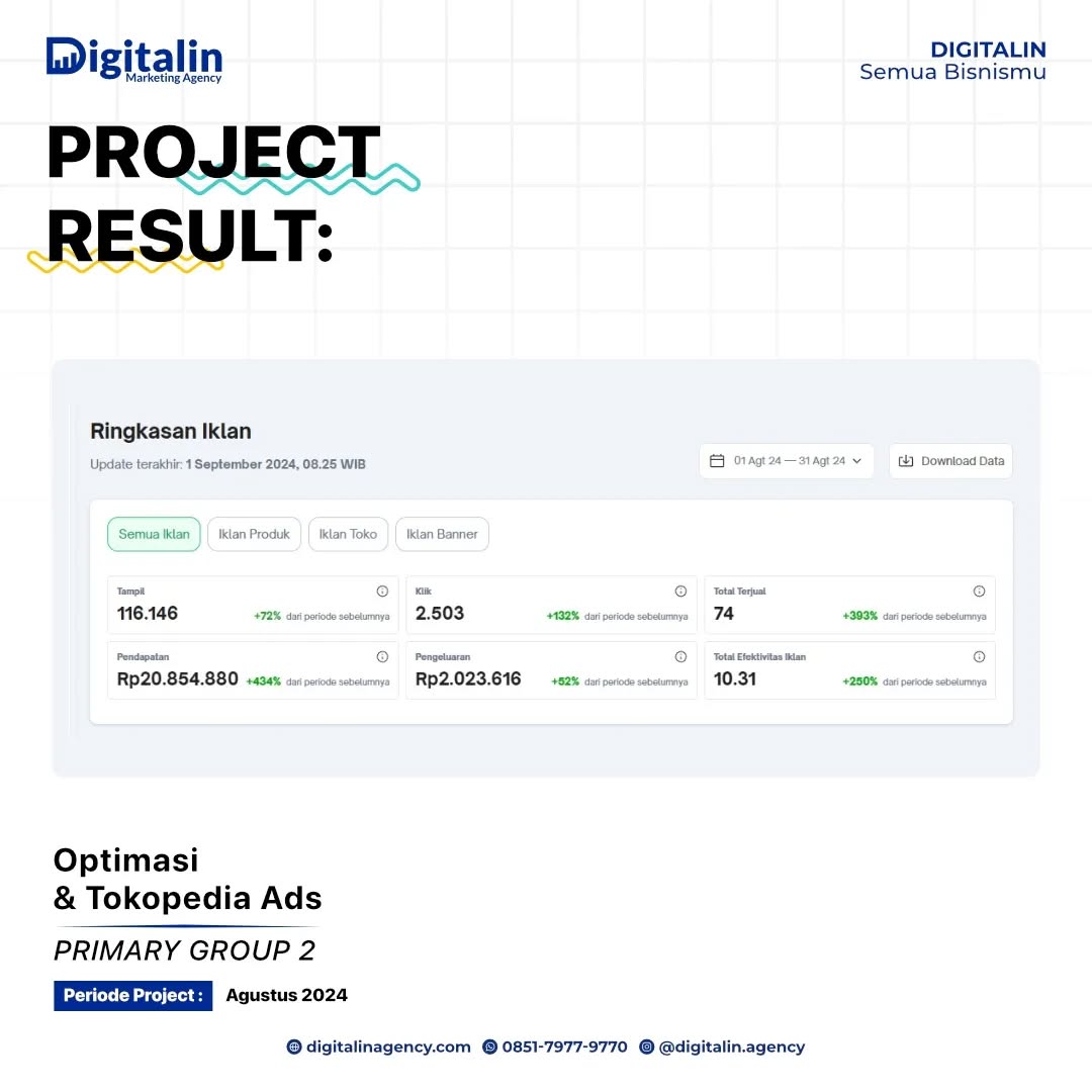 Kampanye Tokopedia Ads pada Agustus 2024 menunjukkan pertumbuhan luar biasa dibanding periode sebelumnya. Hasilnya menunjukkan iklan berjalan sangat efektif dengan ROI yang tinggi dan peningkatan kinerja di semua aspek utama.
